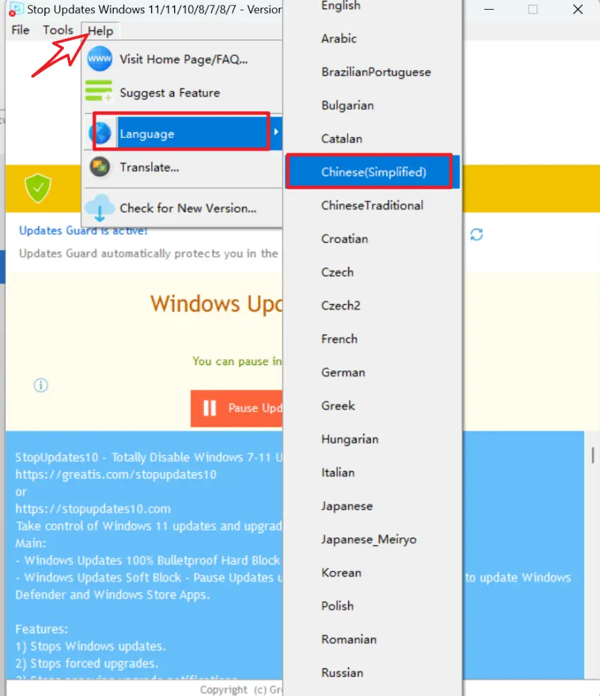 一键禁用烦人的 Windows 自动更新,安装以后,如果是英文,可以在 “Help” 里切换语言为简体中文。