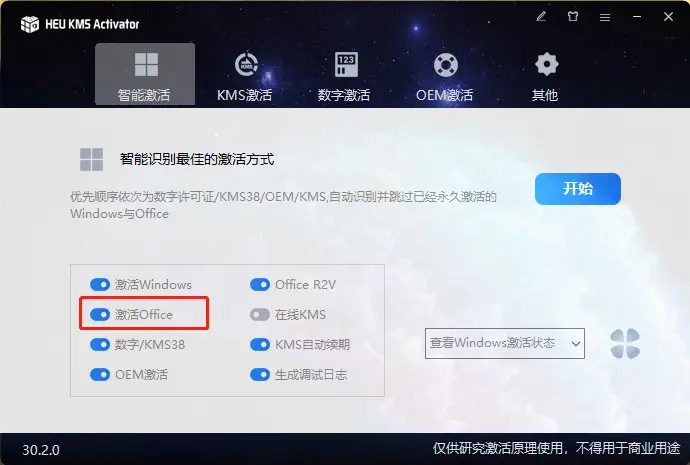 下载完成后打开软件,在智能激活中选择想要激活的软件即可完成激活,适用所有Windows, Office版本,无需联网即可一键激活,支持UEFI的KMS激活工具。
