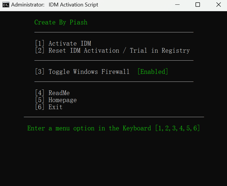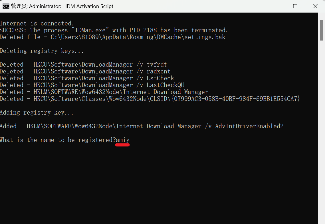 - 运行后,我们在这里选择 “1” 进行激活IDM。注意的是,这个脚本必须联网才能激活,否则会激活失败。