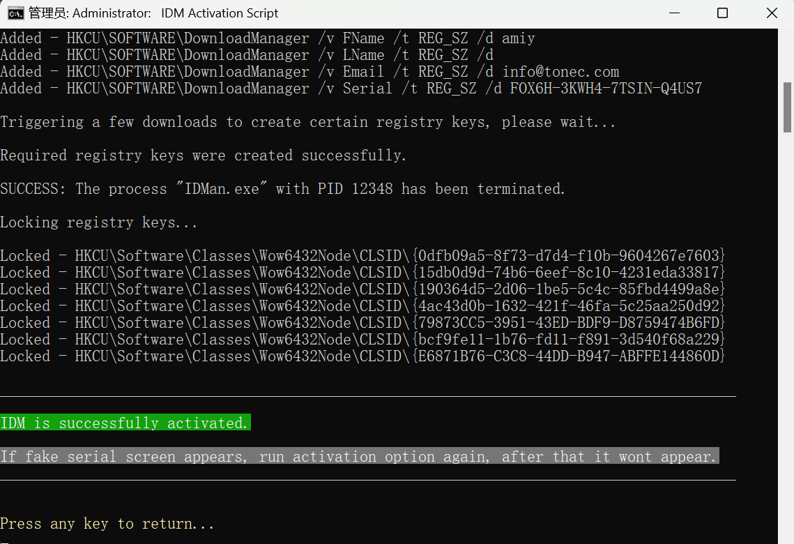 - 当出现 “IDM is successfully activated” 时,让你按任意键返回,即 “Press any key to return…” 时,即表示激活成功了!