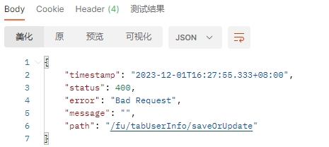 DefaultHandlerExceptionResolver : Resolved [org.springframework.web.bind.MethodArgumentNotValidException: Validation failed for argument [0] in public com.fu99999.note.result.R com.fu99999.note.controller.TabUserInfoController.saveOrUpdate(com.fu99999.note.pojo.entity.TabUserInfo): [Field error in object 'tabUserInfo' on field 'name': rejected value [null]; codes [NotNull.tabUserInfo.name,NotNull.name,NotNull.java.lang.String,NotNull]; arguments [org.springframework.context.support.DefaultMessageSourceResolvable: codes [tabUserInfo.name,name]; arguments []; default message [name]]; default message [姓名不能为空]] ]
