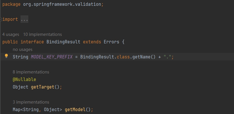 @Valid 的校验不通过会抛出异常,在使用 @Valid 注解的请求参数后面可以跟一个 BindingResult 对象,这个对象的作用是将所有的异常信息存起来。在源码中可以看出 BindingResult 继承 Error 对象,异常的信息可以从 Errors 中拿到。下面我们自己写一个工具类来返回这些信息。1