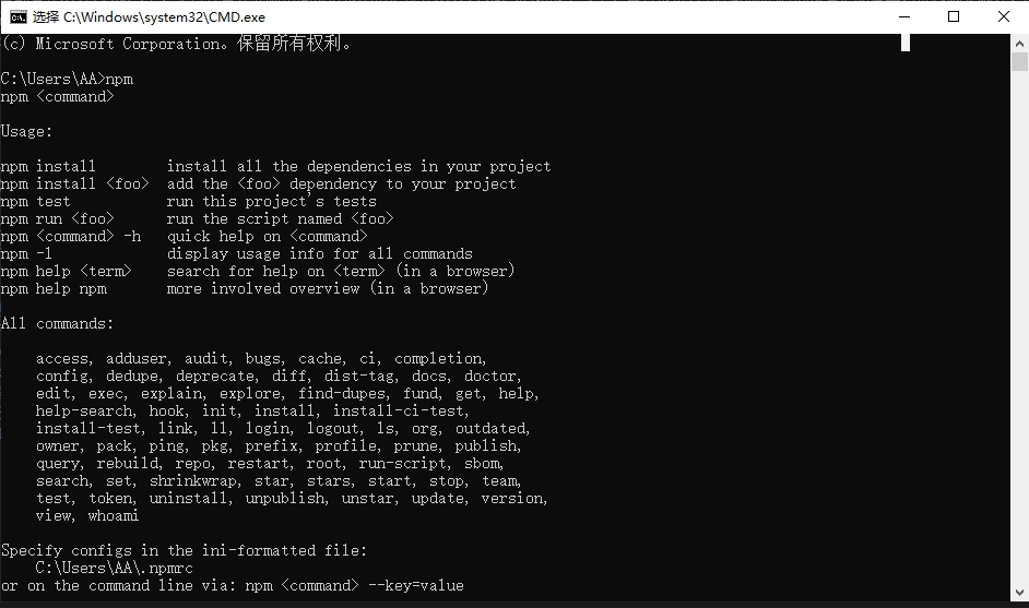 按步骤安装好后Win + R 打开命令提示符,再输入npm 回车,如果出现如图所示的帮助内容则说明npm安装成功且环境配置正确。