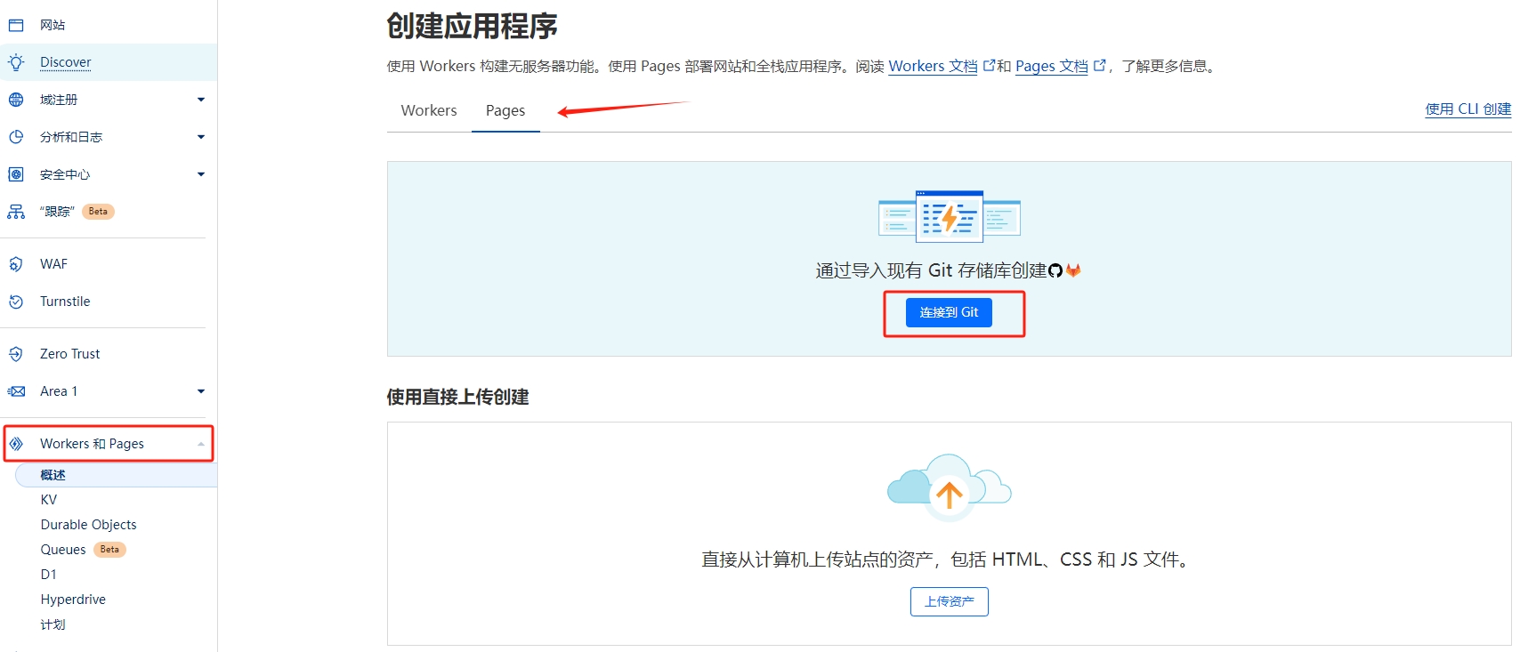 没有Cloudflare的小伙伴先在官网注册好账号后,进入主页点击Workers和Pages,选择Pages连接到Git选择你的博客仓库