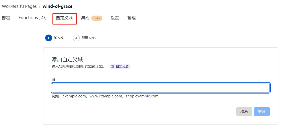 输入你要使用的域名,并在域名解析中添加一个cname解析,指向cloudflare pages分配的地址,就可以用你的域名访问博客了!