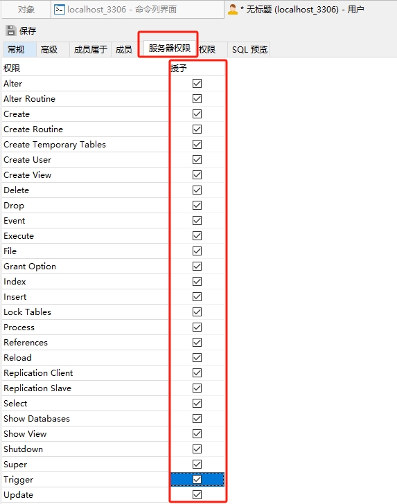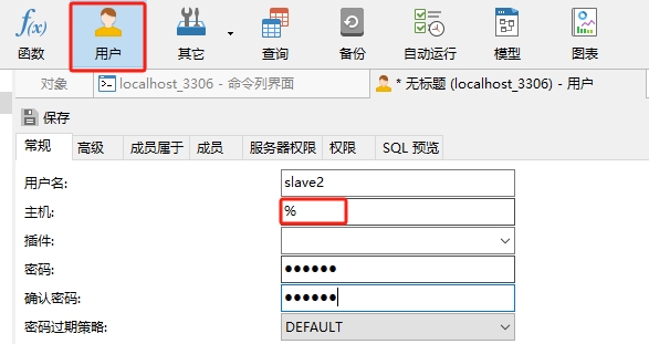 可在my.ini的配置文件中进行修改。 - 给主库添加从库用户,在用户中新建用户,主机的 % 标识任何ip都可以连接到主库,然后把服务器的权限都勾选上。