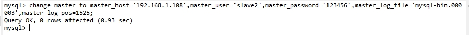 change master to master_host='192.168.1.108',master_user='slave2',master_password='123456',master_log_file='mysql-bin.000003',master_log_pos=1525;