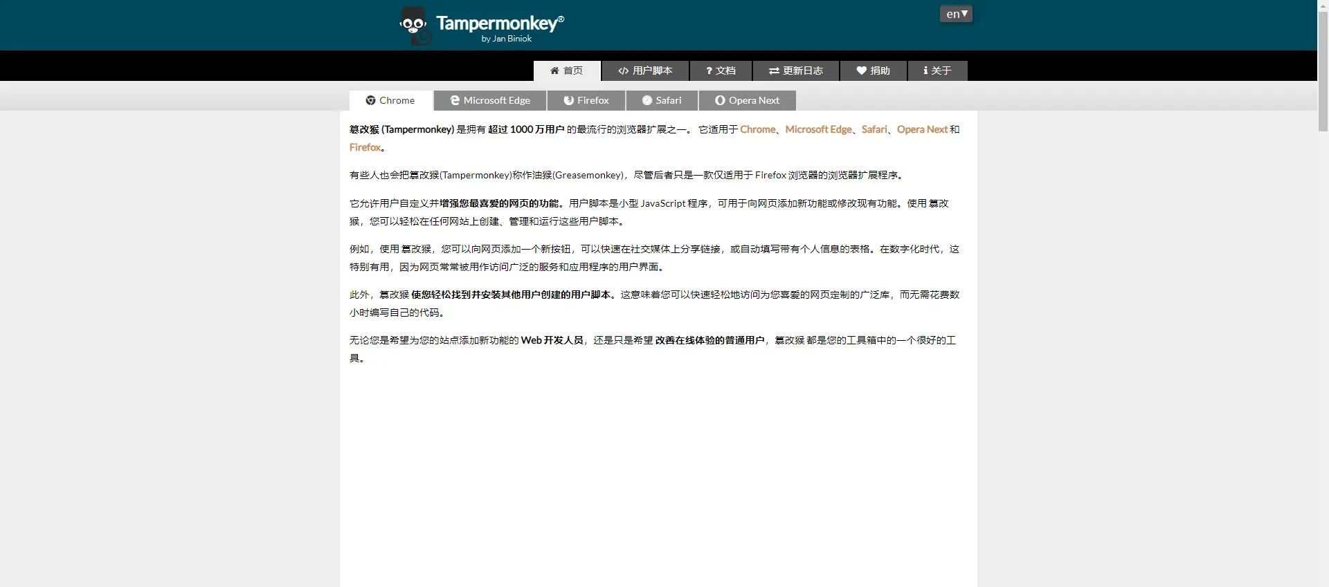 油猴浏览器扩展程序是最流行的浏览器扩展之一, 它可以用户自定义并增强你最喜爱的网页的功能。用户脚本是小型 JavaScript 程序,可用于向网页添加新功能或修改现有功能。使用油猴,可以轻松在任何网站上创建、管理和运行这些用户脚本。官网地址 总被墙,可以直接在本站下载。下载之后直接解压到文件夹,在浏览器中添加扩展程序选择解压的文件夹即可。