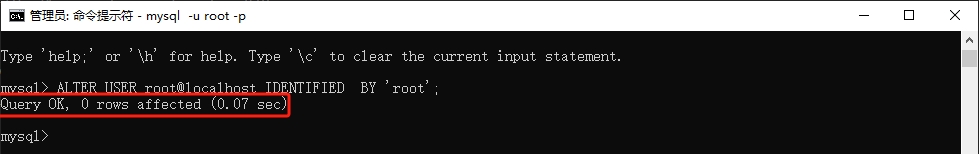 然后输入命令:ALTER USER root@localhost IDENTIFIED BY ‘root’; 将新密码设置为root1